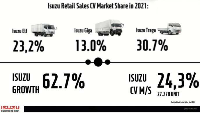 Tahun lalu Isuzu meraih kinerja gemilang. Segmen ELF mencetak rekor tertinggi dengan pangsa pasar 23,2 persen, Giga 13 persen, dan Traga 30,7 persen. Angka ini dibarengi produksi yang meningkat 80 persen pada 2021, dengan total produksi 32.819 unit.